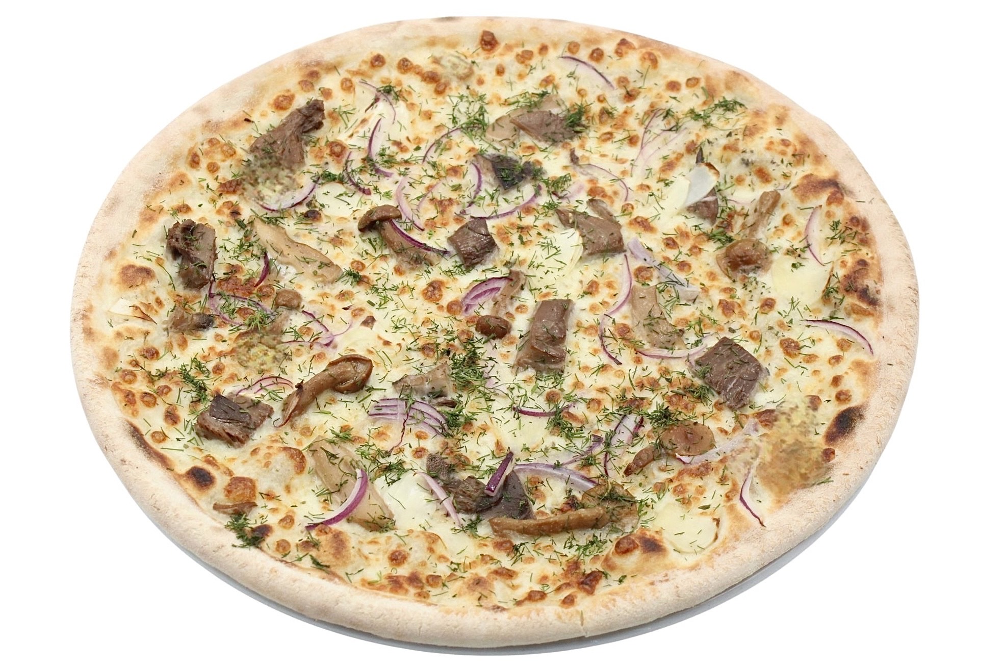 sos ziołowo-śmietanowy, mozzarella, rostbef marynowany w wodzie z kiszonych ogórków, grzyby leśne w oleju słonecznikowym, czosnek, czerwona cebula, koperek