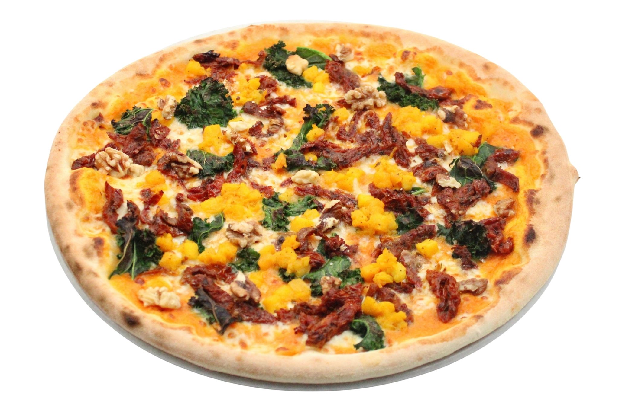 sos śmietanowy z batatem & curry, mozzarella, dynia, suszone pomidory, jarmuż, orzechy włoskie