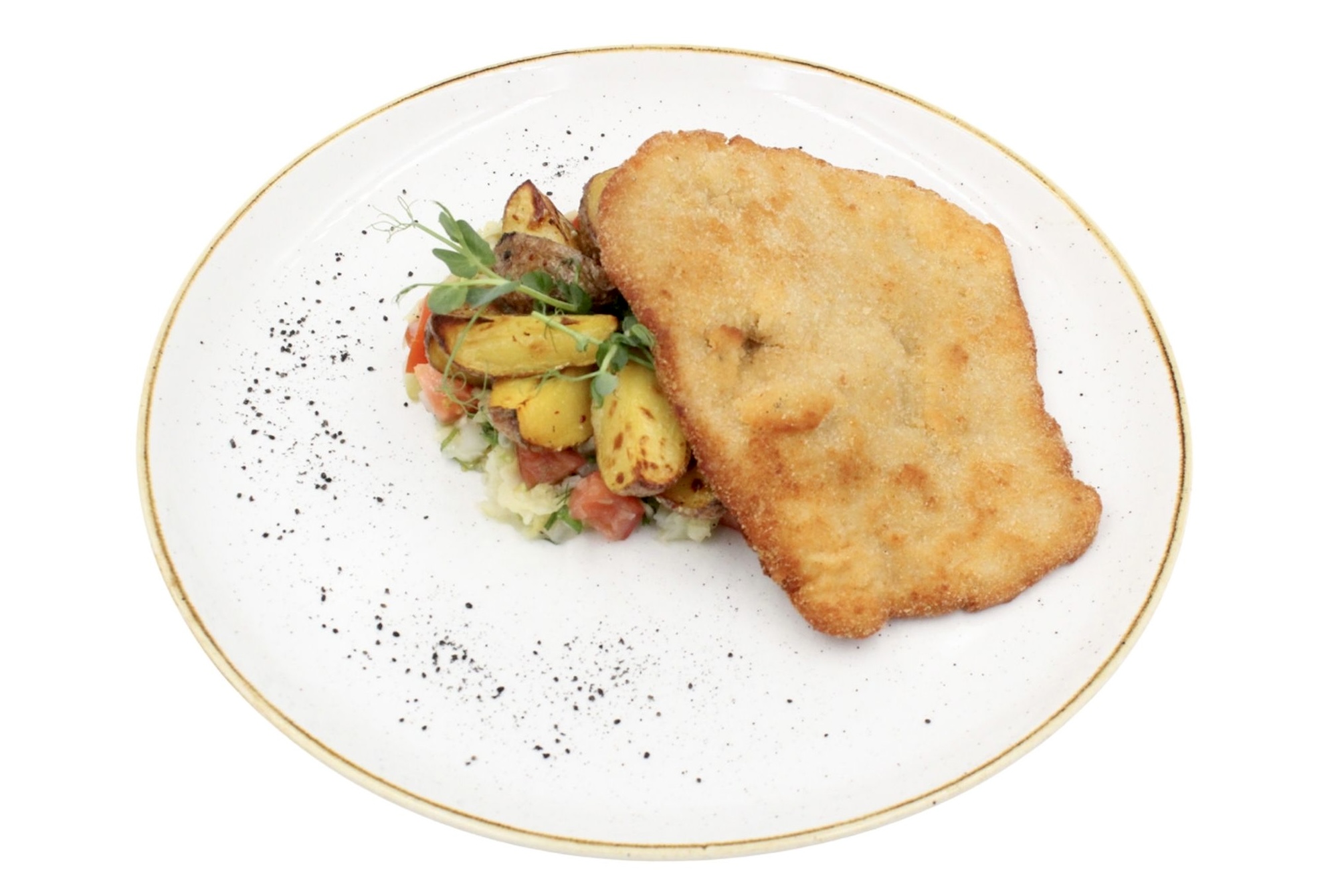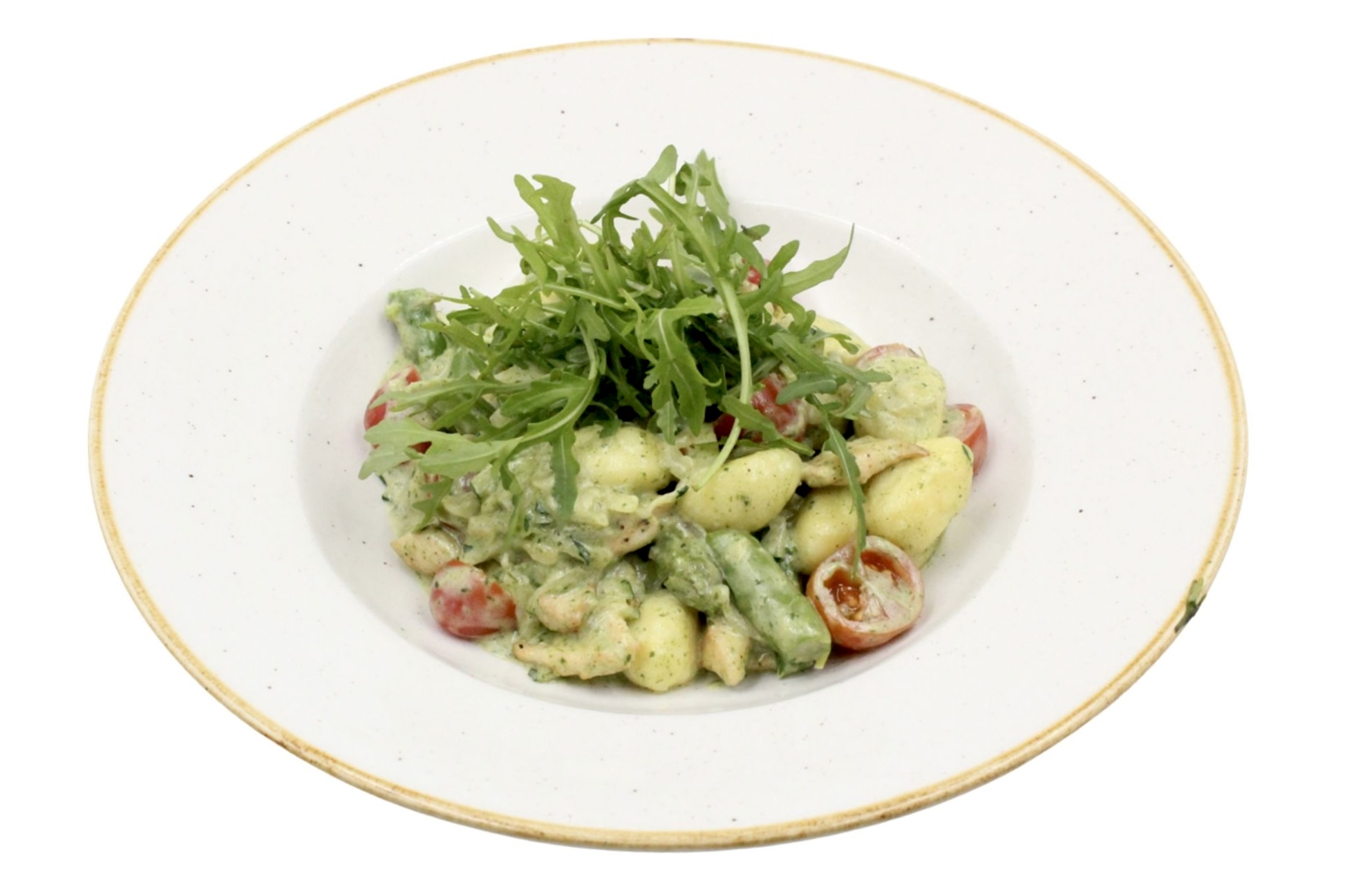 kurczak, pomidorki cherry, zielone szparagi, cukinia, rukolą, czosnek, cebula, sos śmietanowo-bazyliowy / ok. 450 g